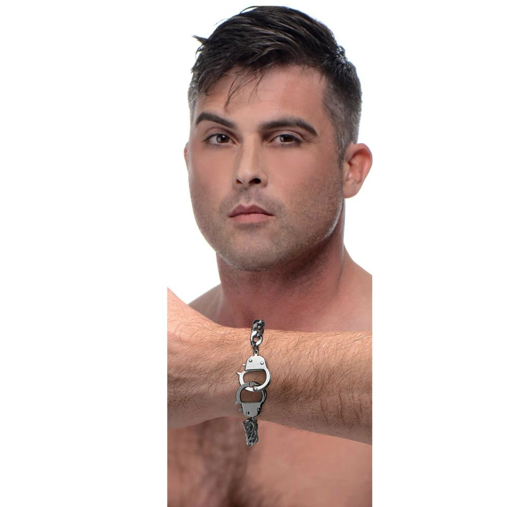 A sturdy chain and handcuffs form a masculine piece of jewelry for Doms, subs, and more. Wear it to signal other kinksters, or as a symbol of your bond with a partner. This accessory is a great gift to show devotion and appreciation. Just like real handcuffs, each circlet opens to secure your wrist, while quick release latches will quickly and easily free your wrist.