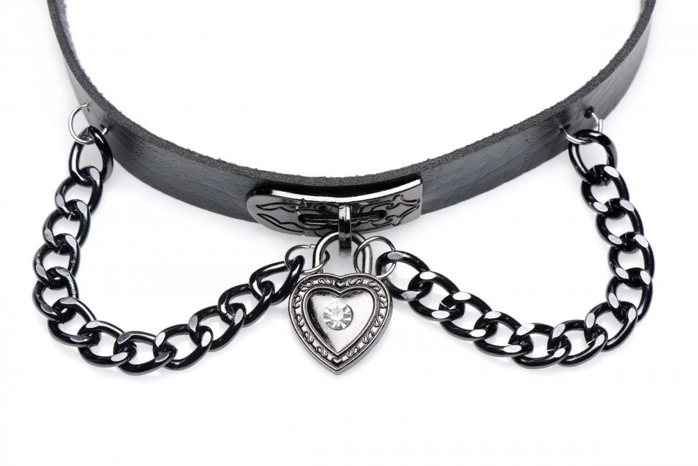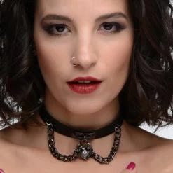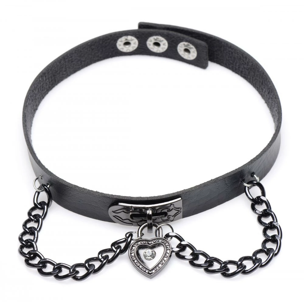 This dark choker can be adjusted from 13 inches to 14.5 inches. Made with durable PU leather and dark metal chain and adorned with a dark metal heart that shines glossy black with a diamond accent.