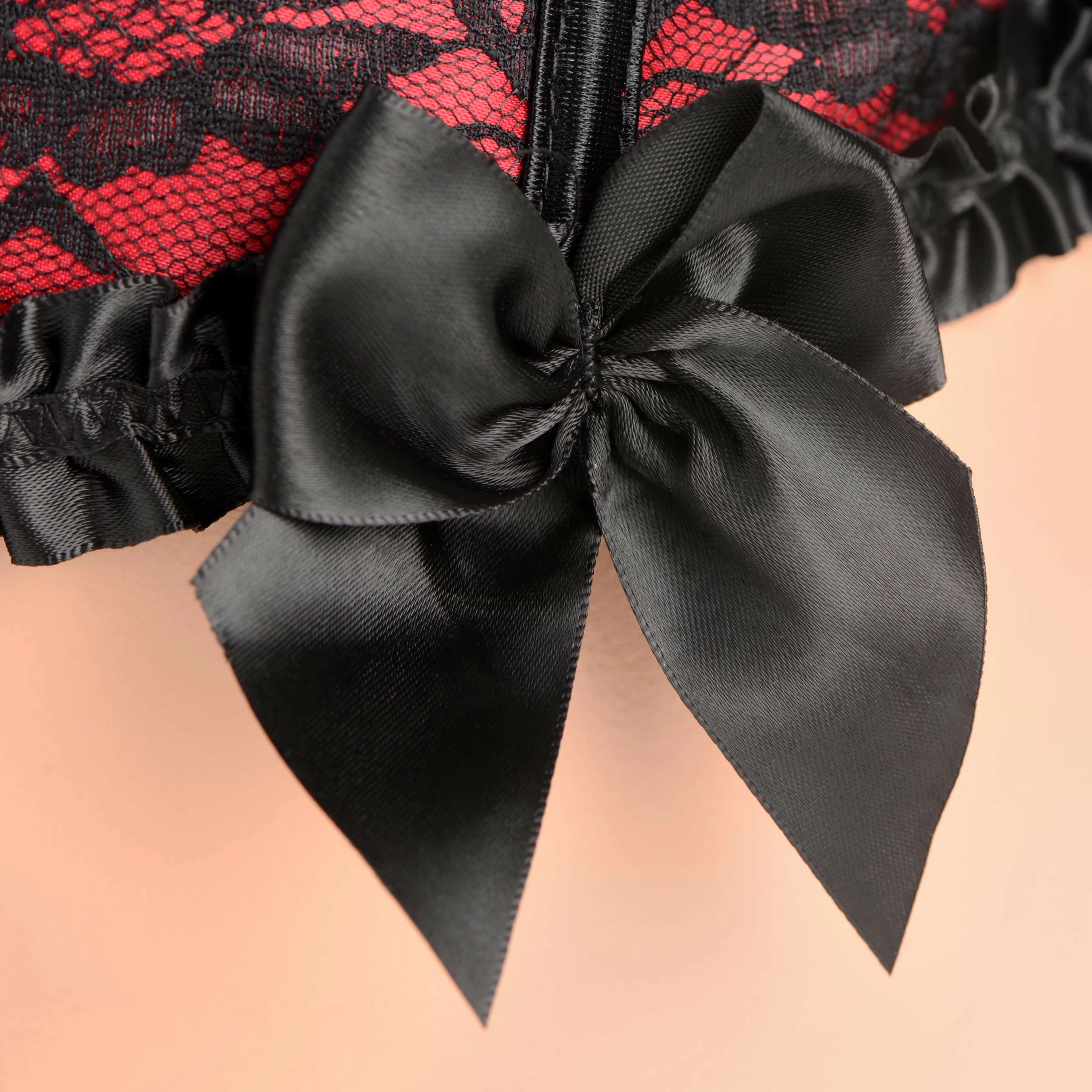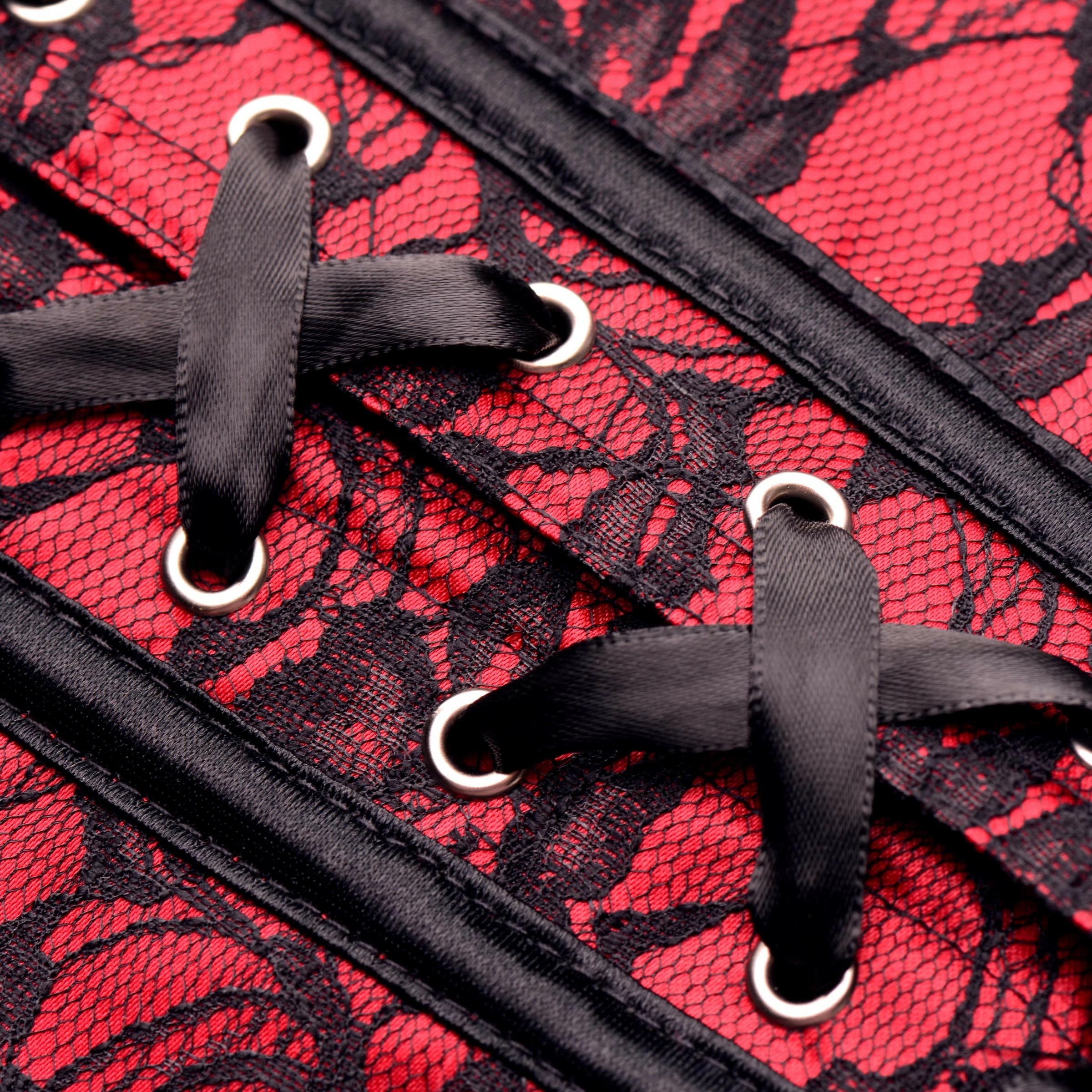 Set the mood with the right outfit! This Scarlet Seduction lace-up corset and thong can be worn alone or combined with pants, skirts, or leggings for a more dressed look, or paired with stockings and heels for a pin-up look. The lace covered scarlet corset made of polyester and spandex supports and stretches while boosting up your bosom with the help of flexible boning that reinforces the elegant, hourglass figure! The black lace, ribbons and ruffles add to the cute, sassy and seductive look and enhance the overall look and feel. The back can be laced up via the ribbons and the front has a metal, busk closure that makes taking it off easy.