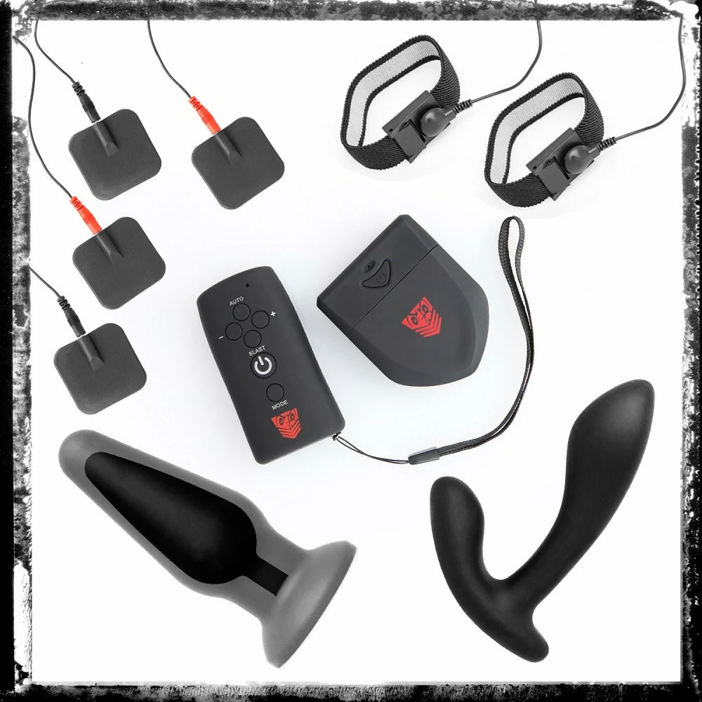 Included in this kit: Wireless remote control, power box, 4 electro pads, 2 electro cock and ball rings, electro prostate stimulator, electro anal plug, 4 sets of wires
