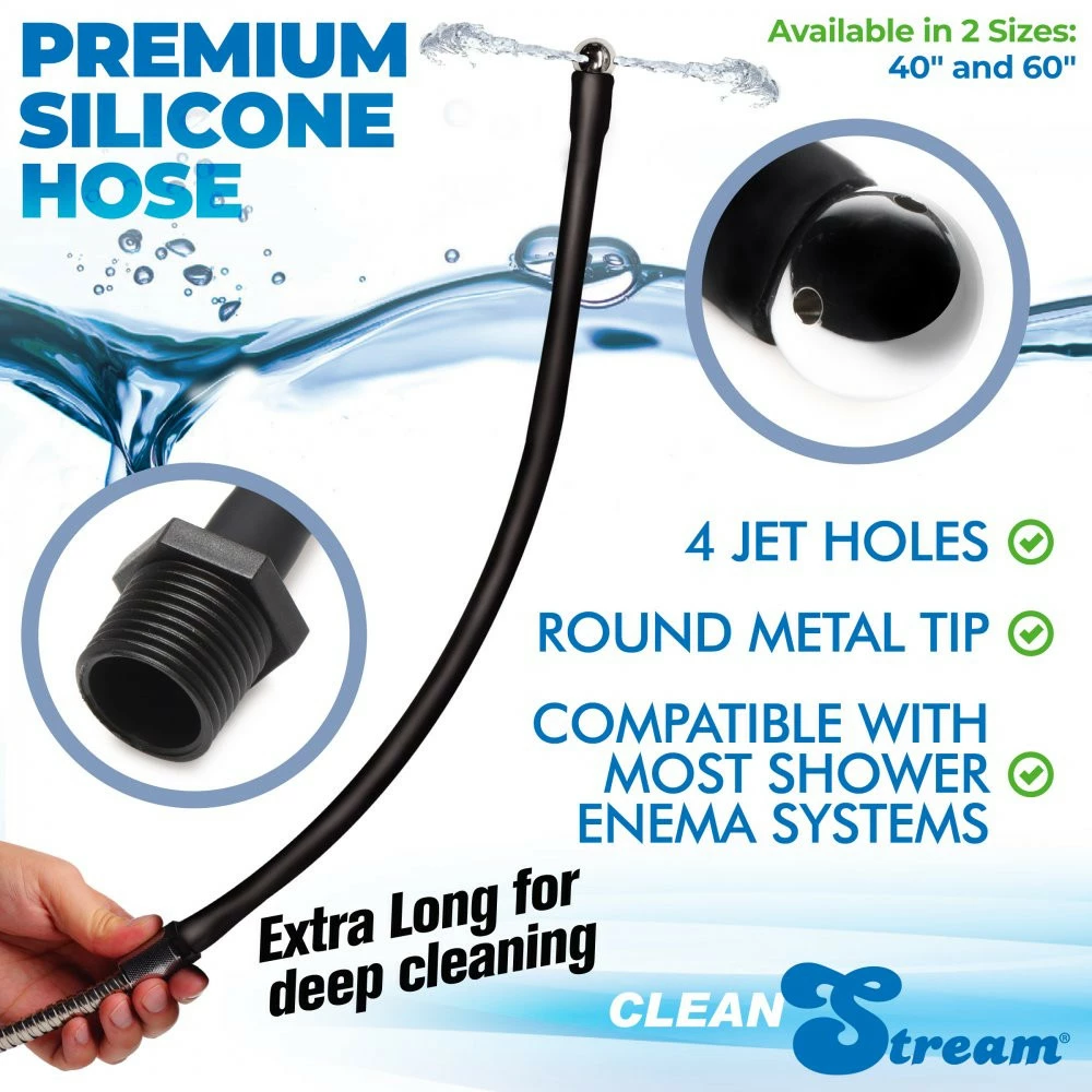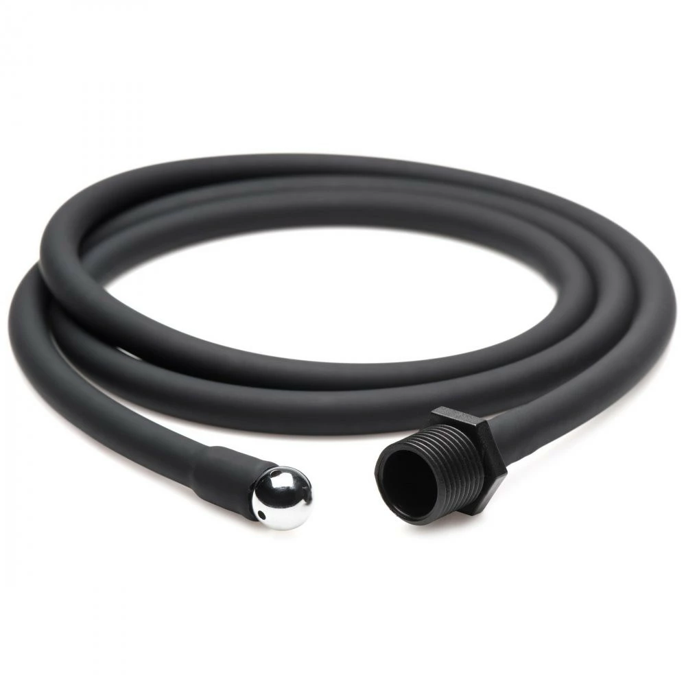 Freshen up and fill up with this 40 inch hose! Compatible with most shower systems, this enema hose has a smooth, metal tip and a long, silicone hose so you can safely enjoy deep cleanings. For fisting and intense anal and enema play thiws hose is perfect for setting you up for success! Not only does it train your ass and colon to handle long, deep, penetrating toys, it’s also enjoyable for those who love enema play! The premium, phthalate-free silicone hose is silky smooth and body-safe for deep penetration; make sure to only use it with water-based lubricants, not silicone. The aluminum alloy metal tip is tapered and round so its firm end can navigate through twists and turns of your insides without harm done to your sensitive internal tissues. Because this product goes so deep inside your body it’s recommended that it is a personal and not shared item for sanitary reasons. To clean the toy afterwards, detach from shower and boil in warm water and a mild solution as is necessary. Use warm water and mild soap between uses if you’d like to keep it attached to the shower.