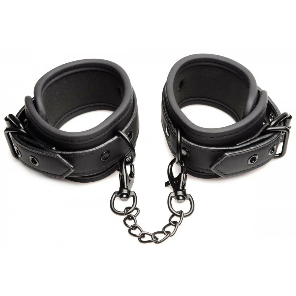 - Faux Leather, Chains and Straps for Bondage: There are two nickel-free adjustable chains that connect to the wrist and ankle cuffs, plus a leash that connects to the collar. All cuff and collar straps are adjustable using a buckle. The 5 D-rings make it easy to attach and detach the chains.