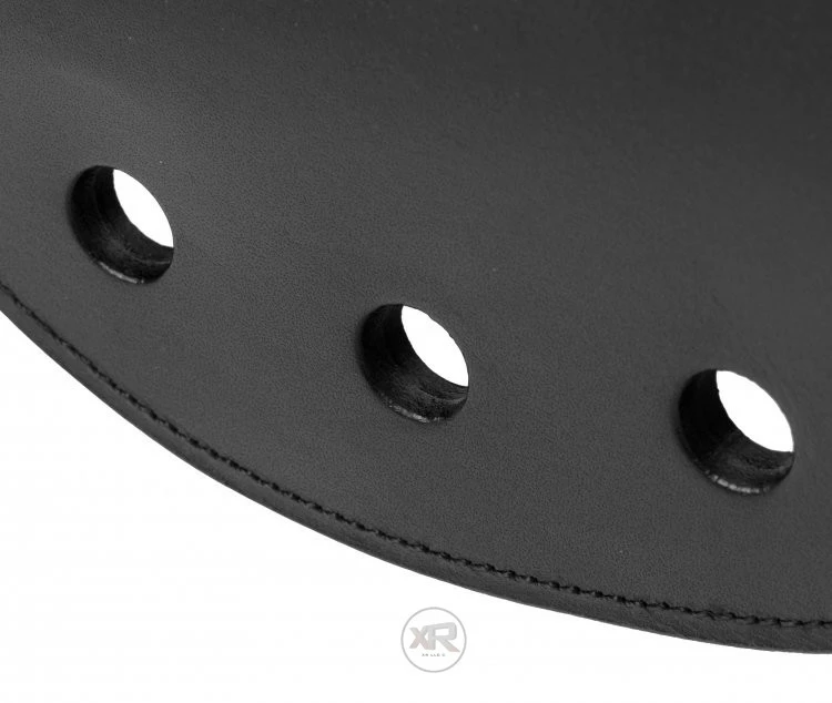 Made of two pieces of thick latigo sewn together, the steel spring in the middle of this paddle provides sturdiness and quite a sting. This paddle is 15.5″ long and 5.75″ wide, the handle is 6.5″ long. The paddle also has 8 holes that help provided more of a sting when laying the smackdown on your subs ass! Also includes a leather loop on the handle used for hanging.