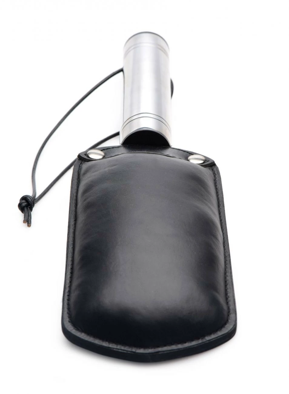 Tease them with the padded side of this paddle, or turn it around and deliver a stinging smack! Ideal for impact play enthusiasts, this instrument of pleasure and pain can come into play no matter how your masochist is behaving, and no matter what mood you’re in. Made of high-grade leather, this paddle is not to be taken lightly. The sturdy metal handle will send a charge of power from hand through your whole body! For extra security, slip the loop at the end around your wrist, or use it for hanging storage.
